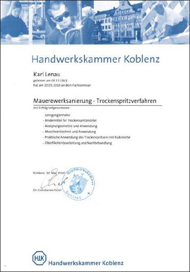 Aber auch wir bilden uns ständig weiter. Im Mai 2010 haben wir z.B. an einem Fachseminar zum Thema Mauerwerksanierung im Trockenspritzverfahren teilgenommen.