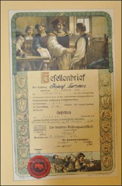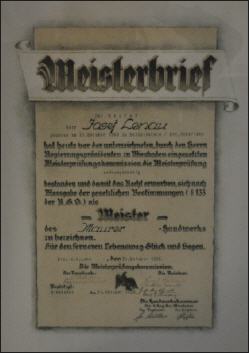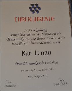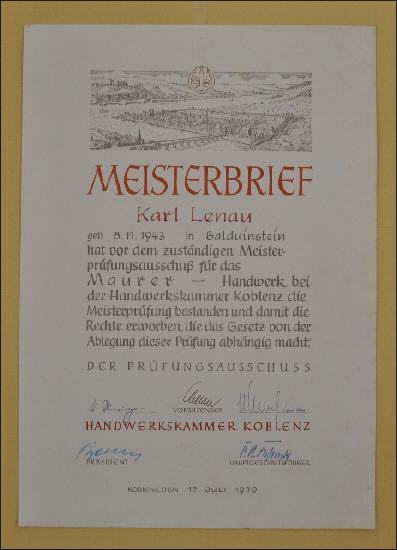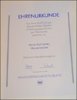 Mehr als 30 Jahre war Karl Lenau ehrenamtlich Mitglied im Gesellenprüfungsausschuss der Maurer. Viele Jahre war er Vorsitzender und „schlug“ in dieser Zeit so manchen Lehrling nach bestandener Prüfung zum Gesellen.